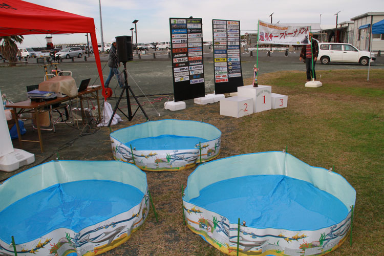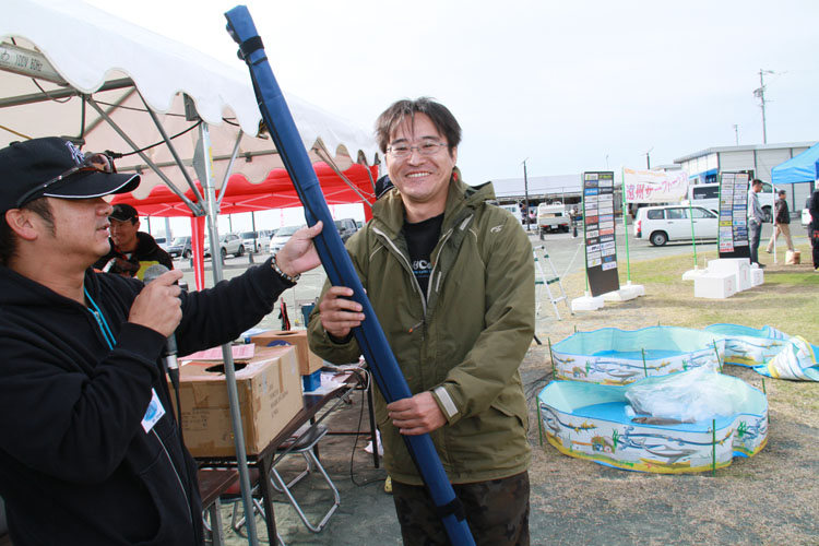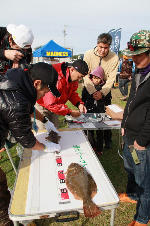 結果、メインターゲットのヒラメのウエイインは21匹という結果となり、最高62.5cm 50cm以上の良型は6匹持ち込まれ大いに盛り上がりました。会場の雰囲気も、釣果にこだわらず参加者の皆さんが楽しんでくれ、メーカー出展ブースでは、メーカー担当者との直接意見の交換や新製品の紹介などを見聞きしていただけたようでした。