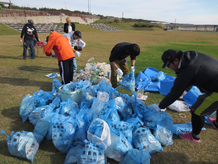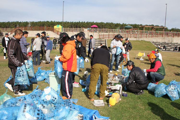 参加資格であるビーチクリーン活動も今回も滞りなく行われ、沢山の砂浜のゴミが回収されました。参加者各自が会場へ持ち込み指定した場所へそれぞれ分別、翌日 磐田市のご協力により無料廃棄していただくことが出来ました。今後も大会が行われる限りゴミの回収も続けていきます。