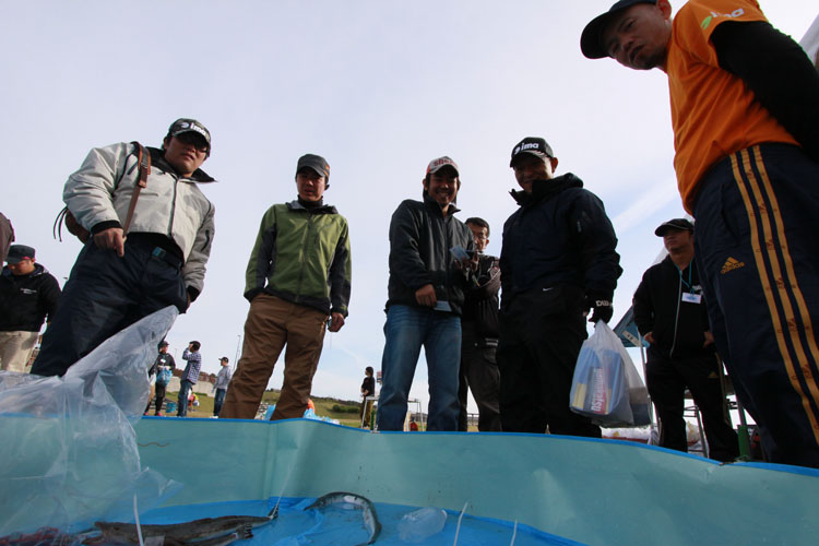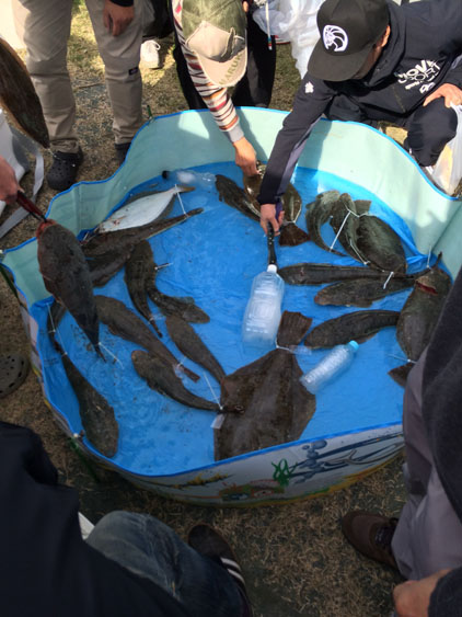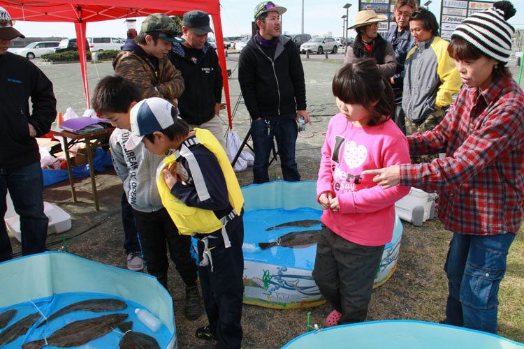 釣果展示スペースに、魚が 次々と入れられ 参加者や 一般の皆さんも 感心しながら覗きlこむ! |