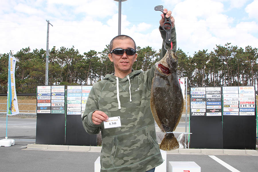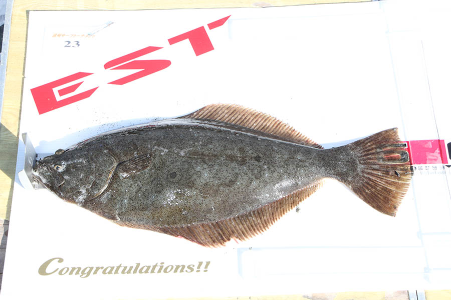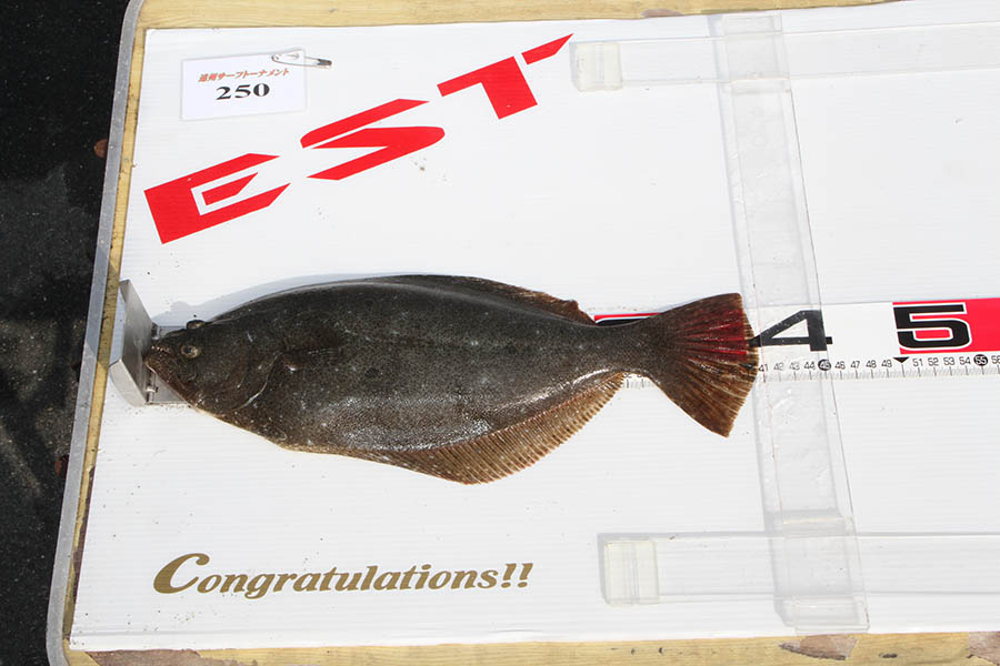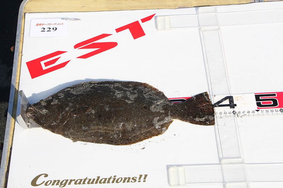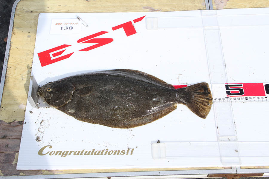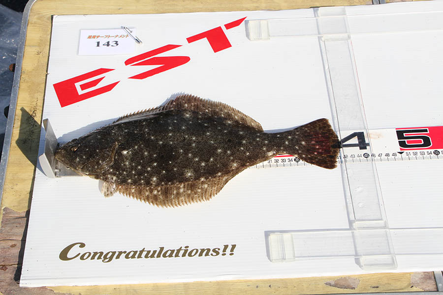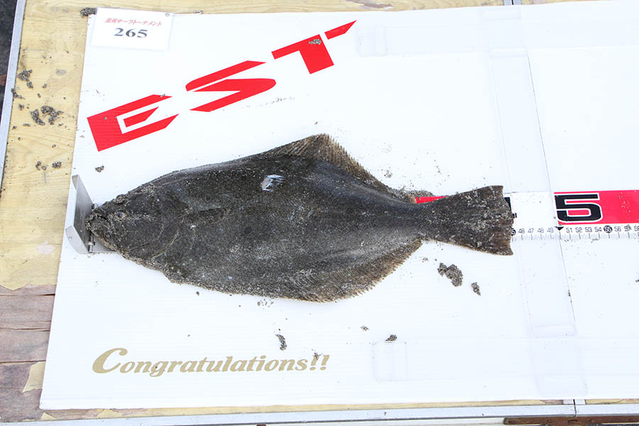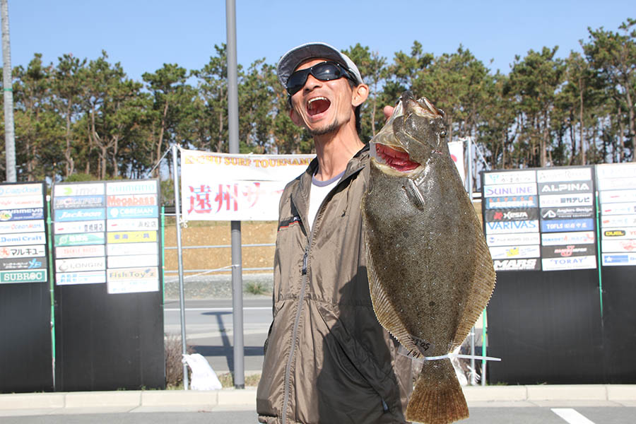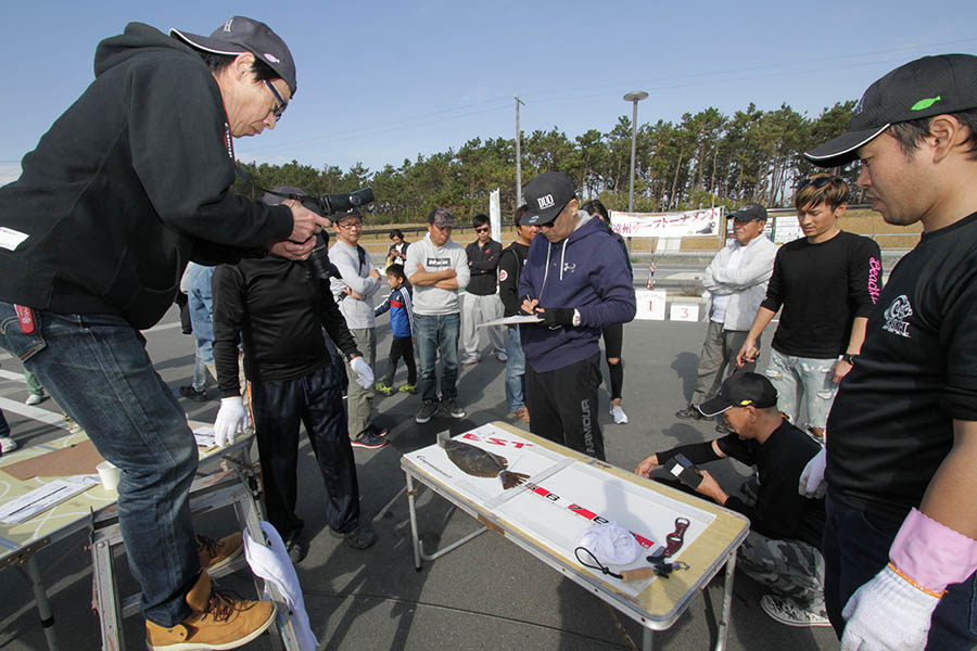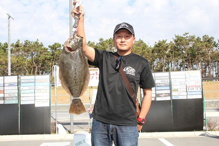 大会釣果としましては、天候とは真逆で、ヒラメ40cm以上のウエイインは20名22匹となり違う意味のタフコンディションとなりましたが、リリースした40cm以下のソゲサイズや他の魚種はかなりの釣果もあったようでした。この夏の台風の影響からやっと落ち着いた遠州灘で、これからのハイシーズンを迎える前の腕比べのような結果となったことは間違いありません。優勝したパッチJr.氏は今大会最高のレコード記録71.5cm他2枚という結果を計測場所に持ち込んだ時は会場が一瞬どよめき 人だかりができました。
