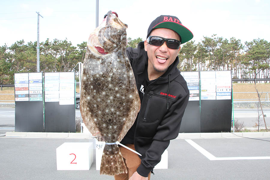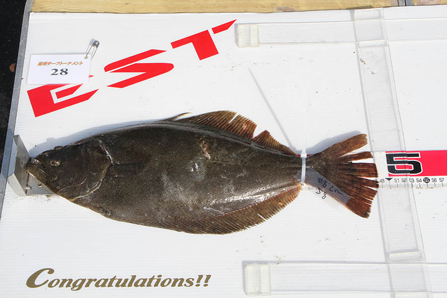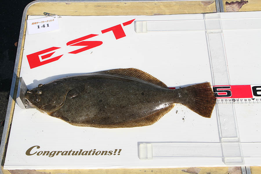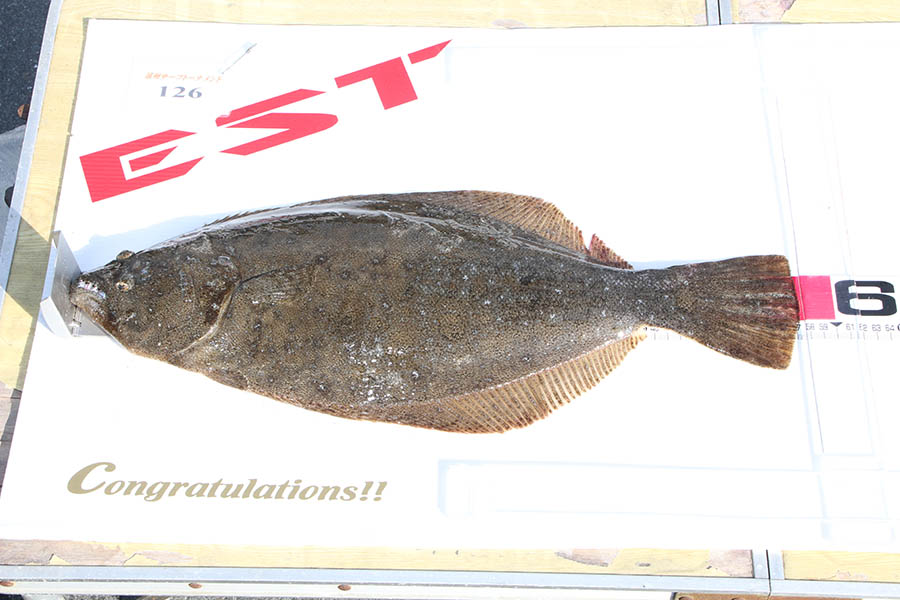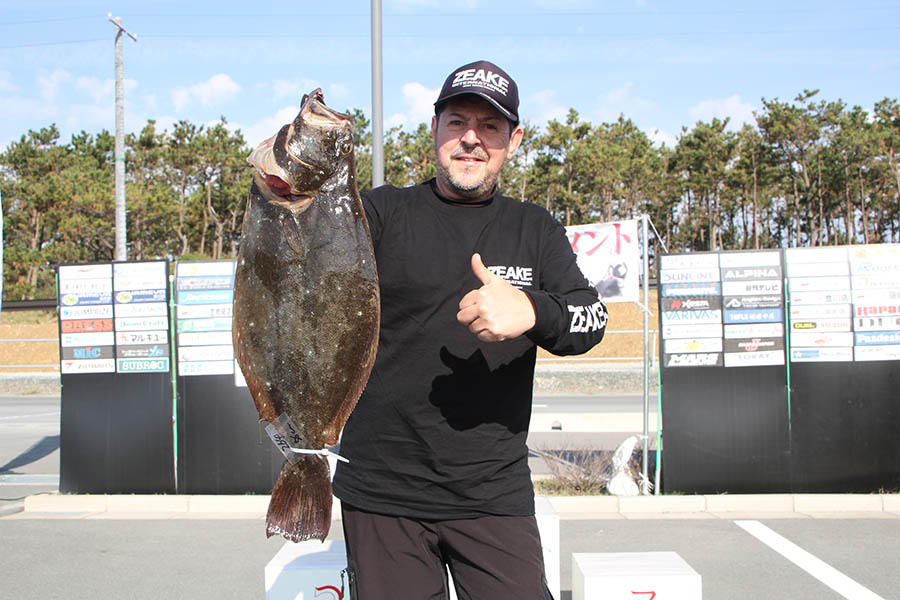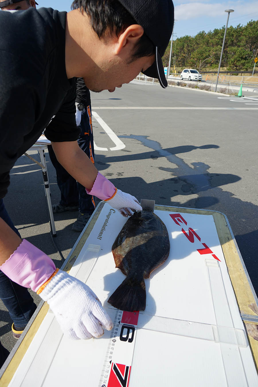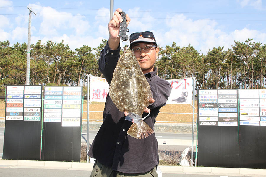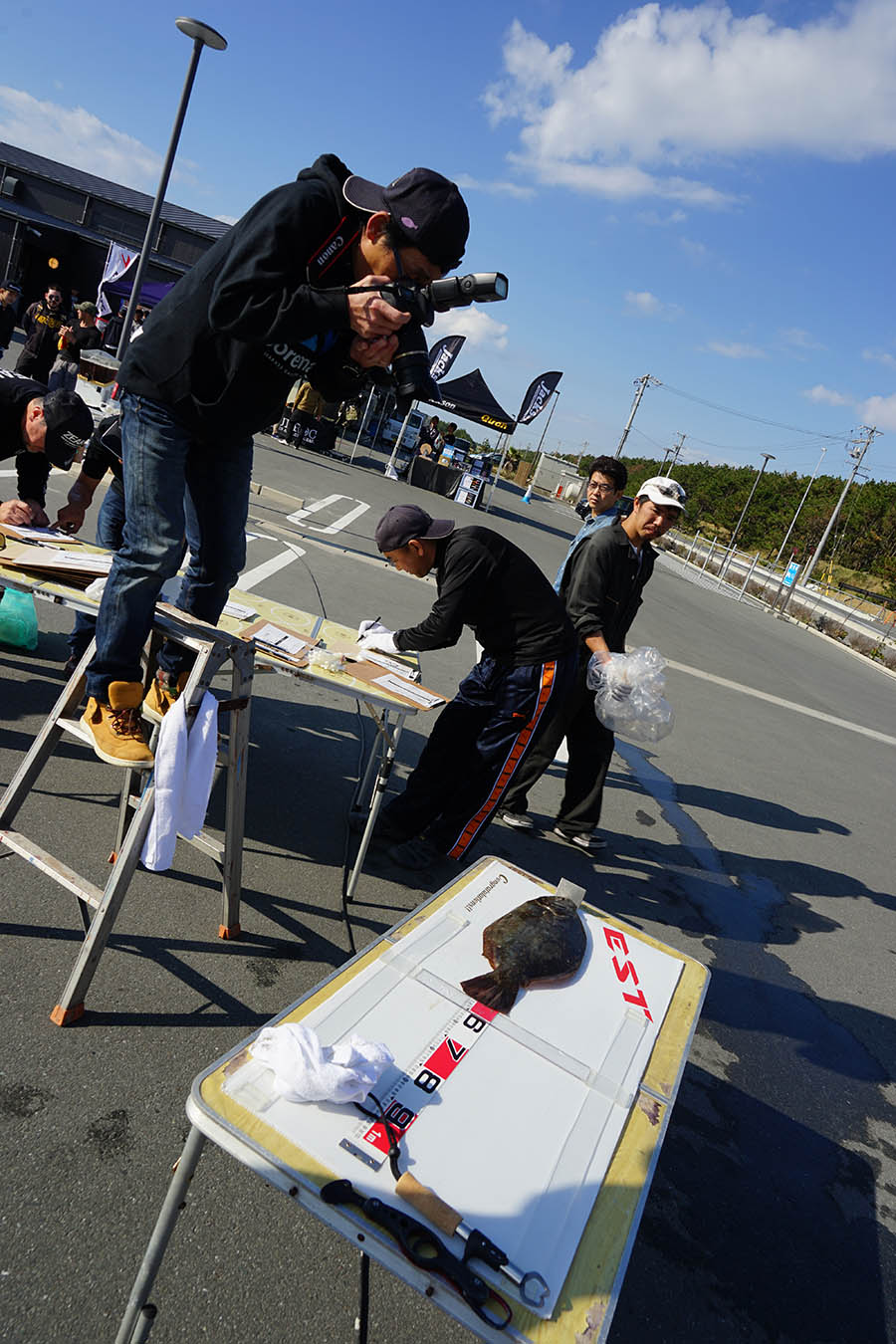 大会釣果としましては、天候とは真逆で、ヒラメ40cm以上のウエイインは20名22匹となり違う意味のタフコンディションとなりましたが、リリースした40cm以下のソゲサイズや他の魚種はかなりの釣果もあったようでした。この夏の台風の影響からやっと落ち着いた遠州灘で、これからのハイシーズンを迎える前の腕比べのような結果となったことは間違いありません。優勝したパッチJr.氏は今大会最高のレコード記録71.5cm他2枚という結果を計測場所に持ち込んだ時は会場が一瞬どよめき 人だかりができました。