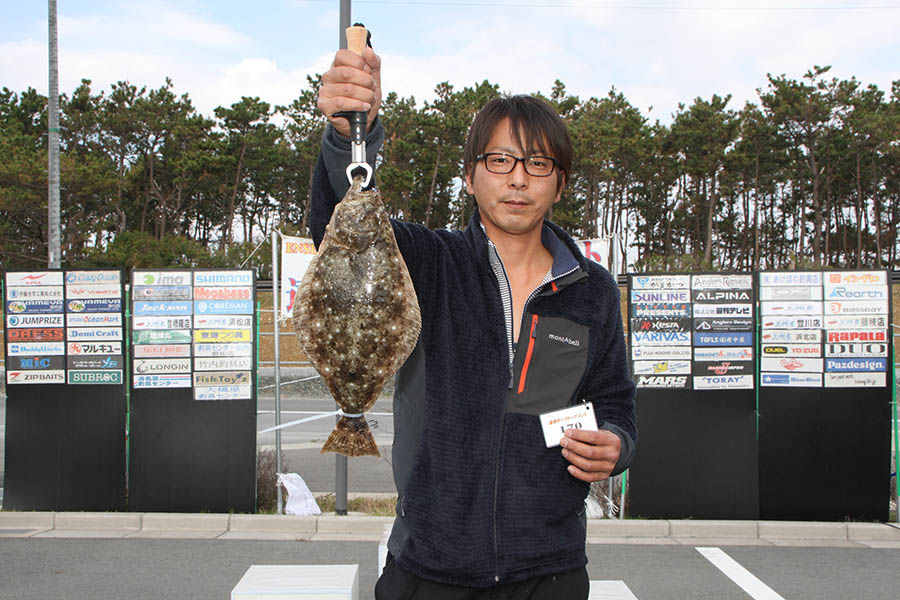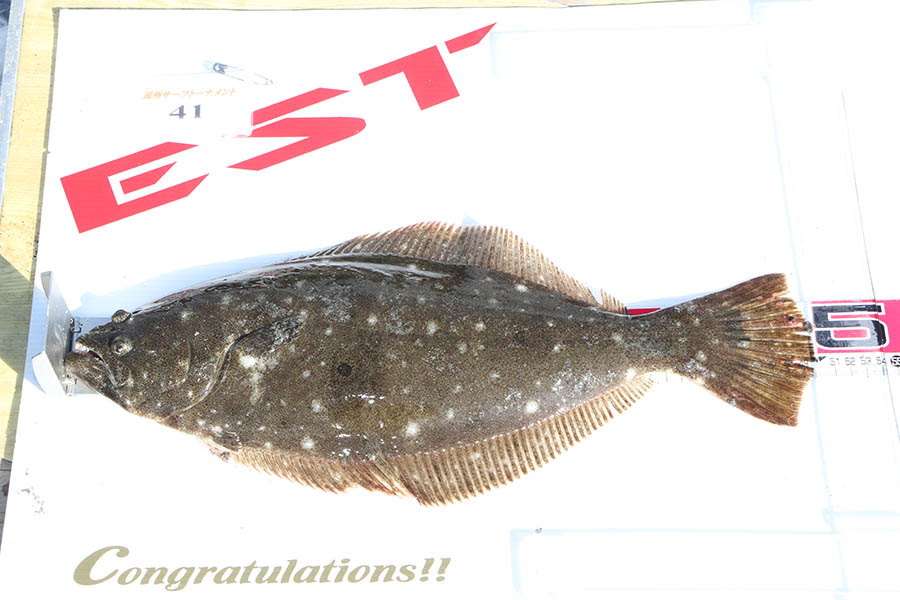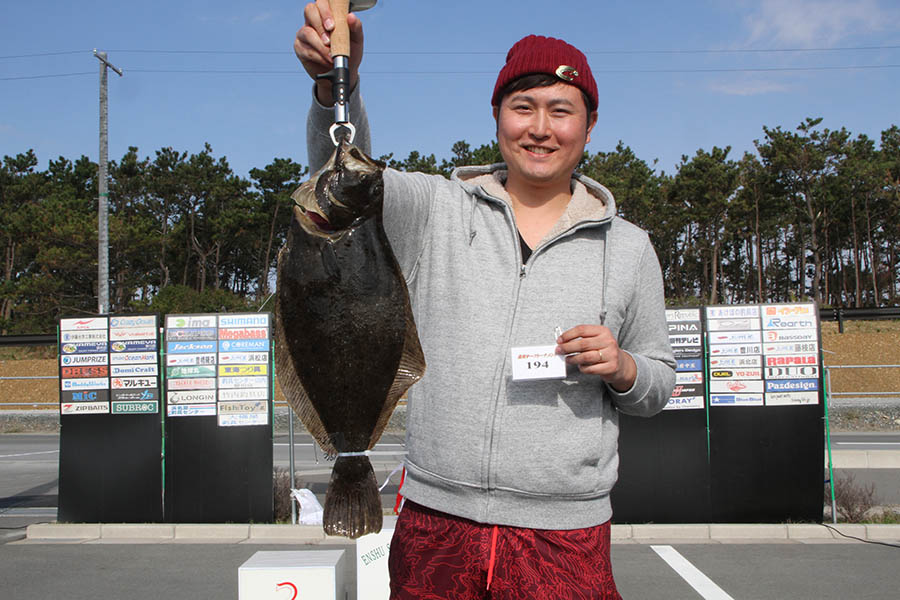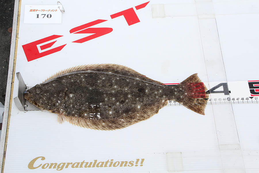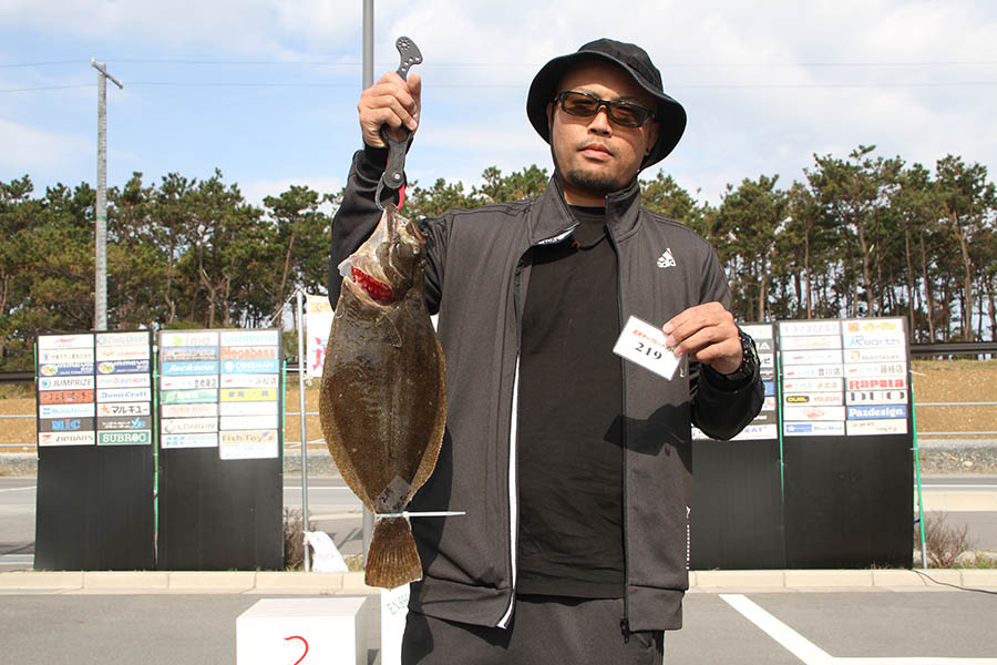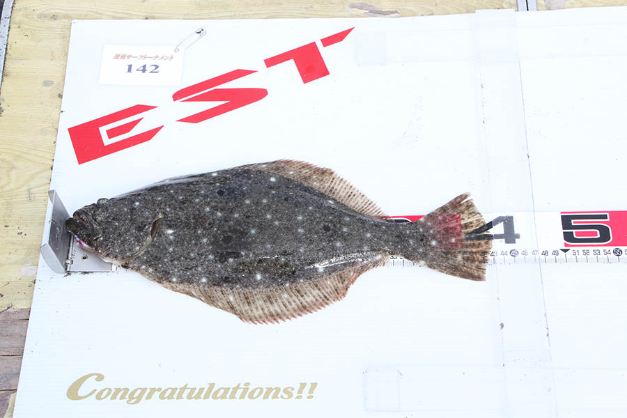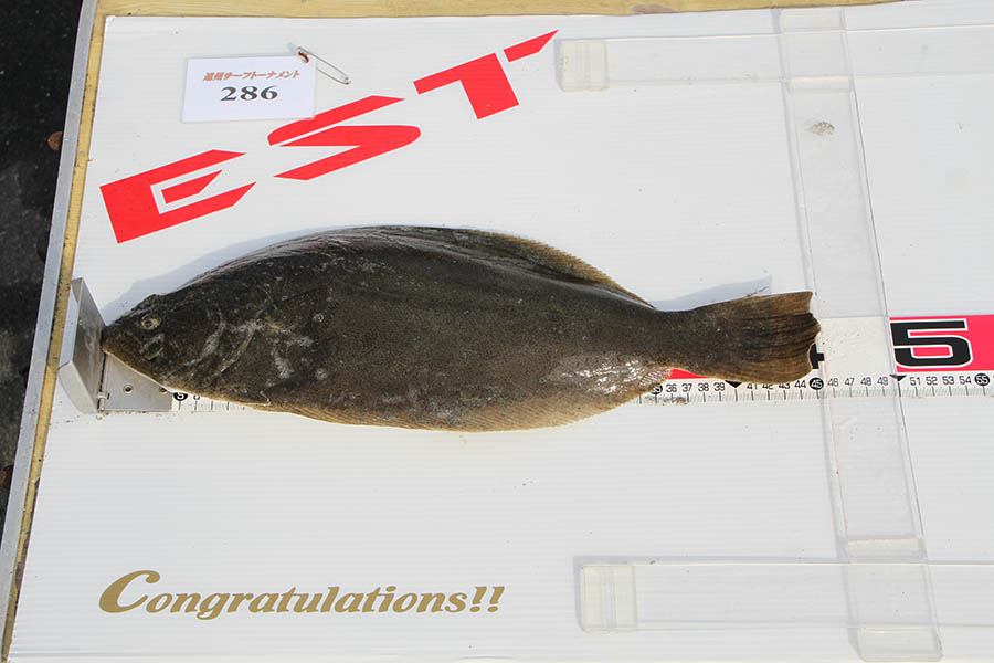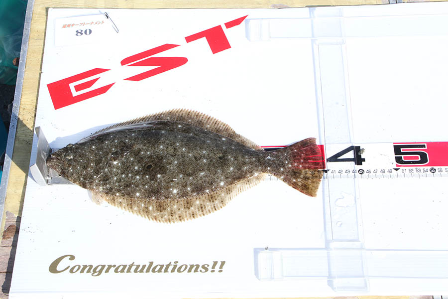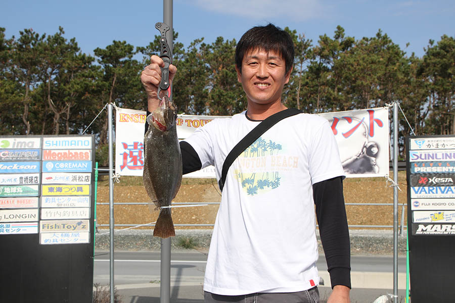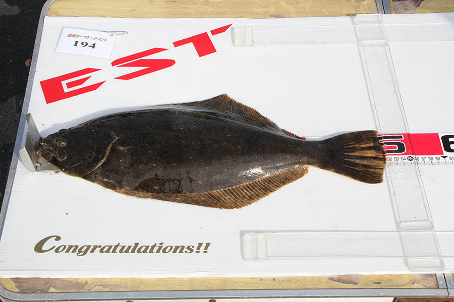 大会釣果としましては、天候とは真逆で、ヒラメ40cm以上のウエイインは20名22匹となり違う意味のタフコンディションとなりましたが、リリースした40cm以下のソゲサイズや他の魚種はかなりの釣果もあったようでした。この夏の台風の影響からやっと落ち着いた遠州灘で、これからのハイシーズンを迎える前の腕比べのような結果となったことは間違いありません。優勝したパッチJr.氏は今大会最高のレコード記録71.5cm他2枚という結果を計測場所に持ち込んだ時は会場が一瞬どよめき 人だかりができました。