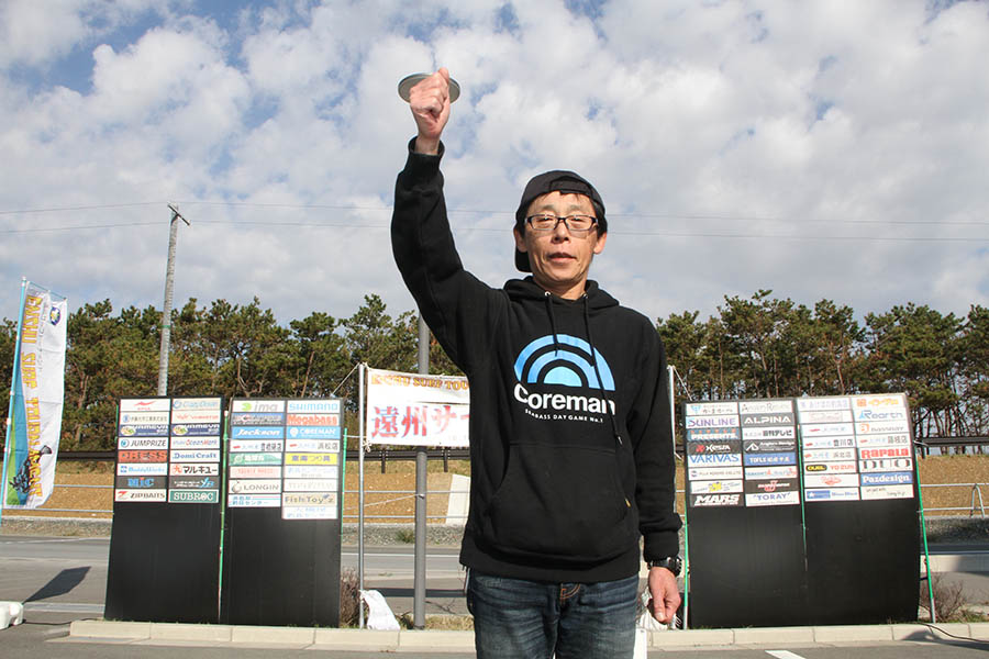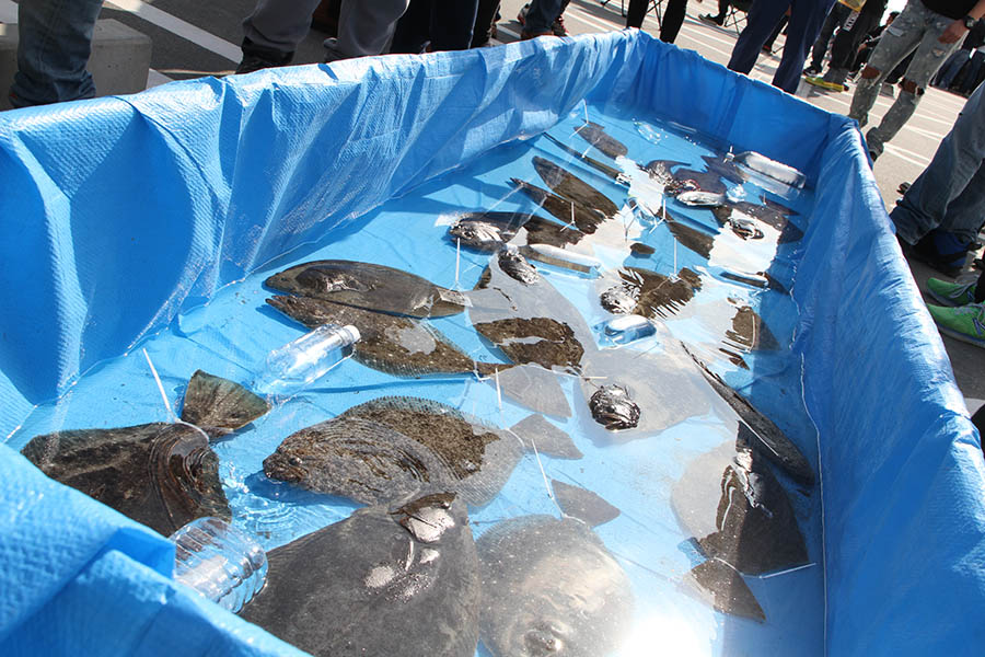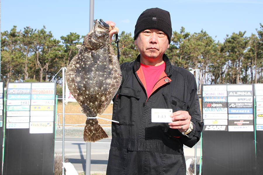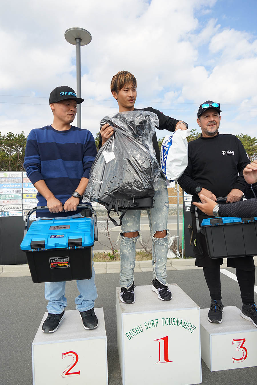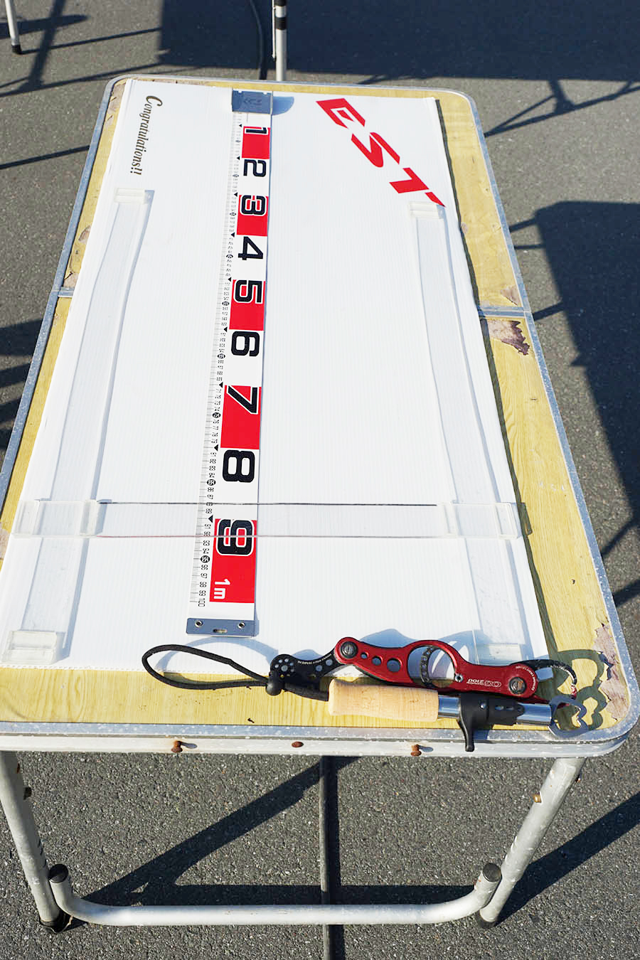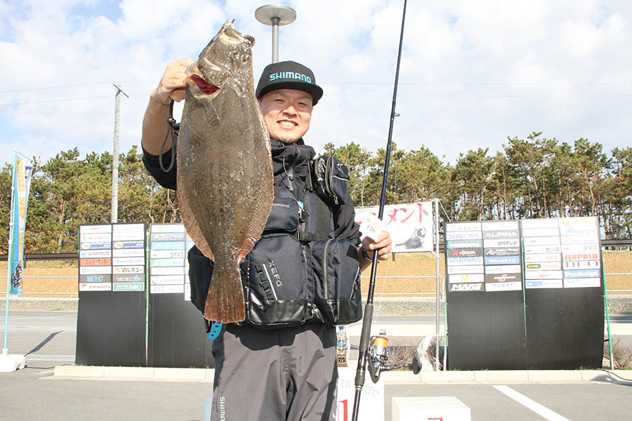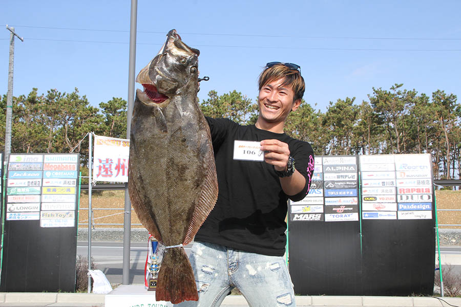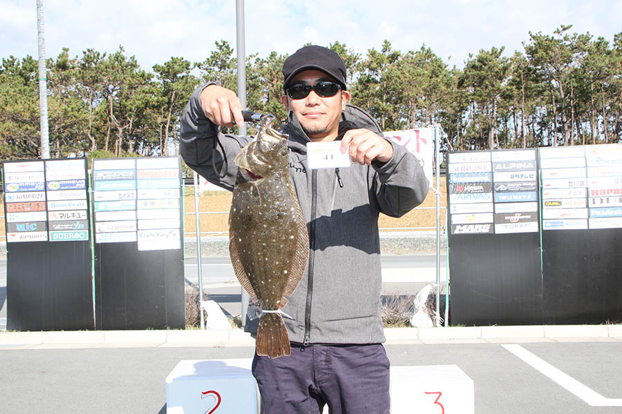 大会釣果としましては、天候とは真逆で、ヒラメ40cm以上のウエイインは20名22匹となり違う意味のタフコンディションとなりましたが、リリースした40cm以下のソゲサイズや他の魚種はかなりの釣果もあったようでした。この夏の台風の影響からやっと落ち着いた遠州灘で、これからのハイシーズンを迎える前の腕比べのような結果となったことは間違いありません。優勝したパッチJr.氏は今大会最高のレコード記録71.5cm他2枚という結果を計測場所に持ち込んだ時は会場が一瞬どよめき 人だかりができました。